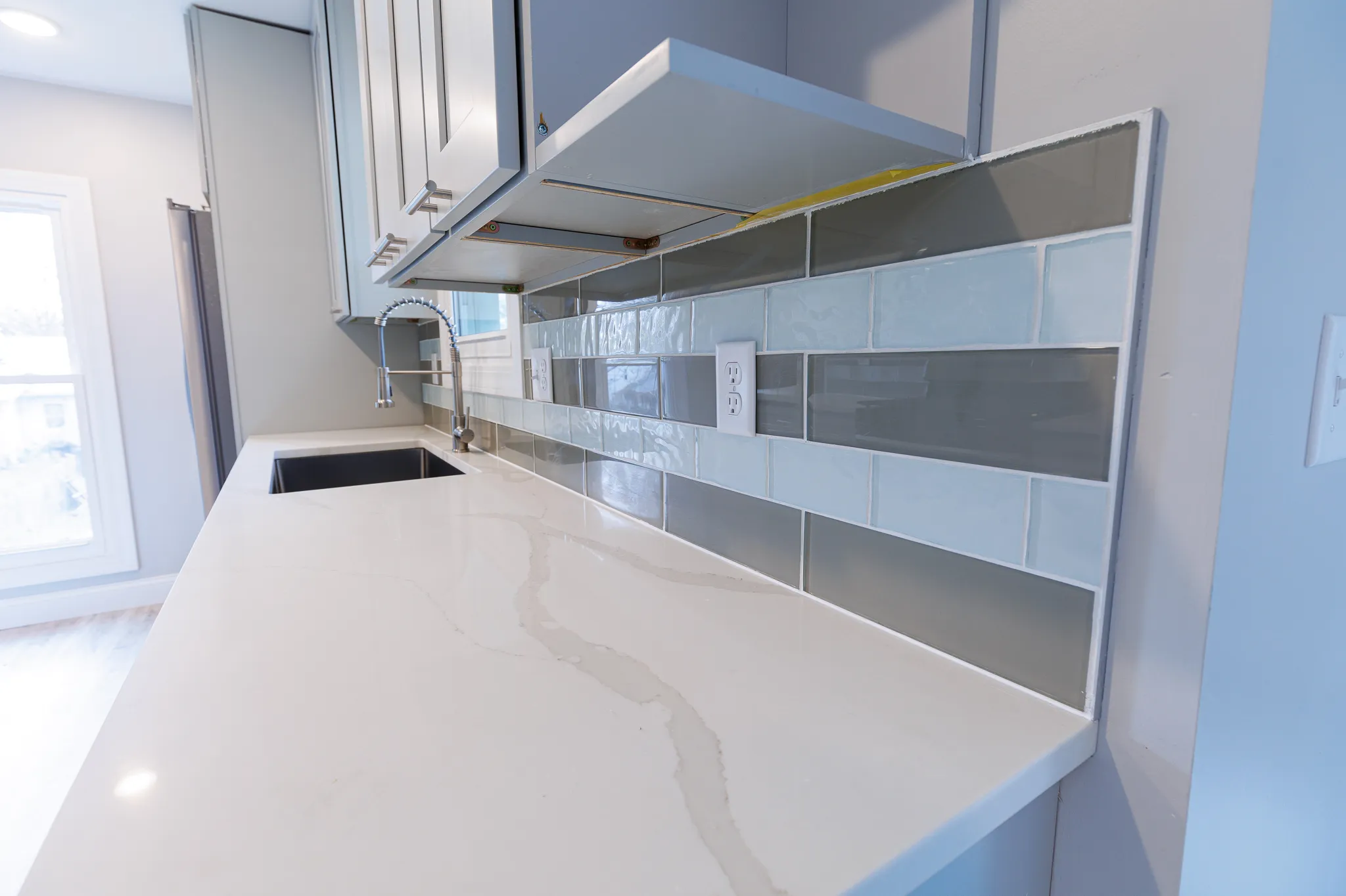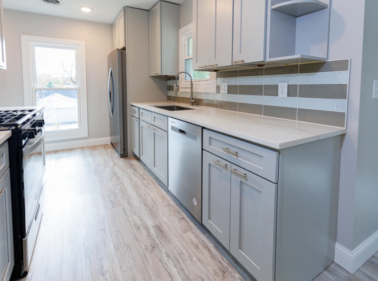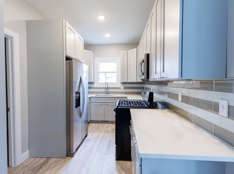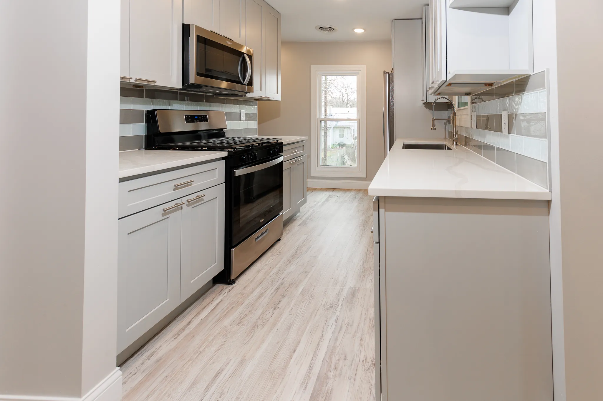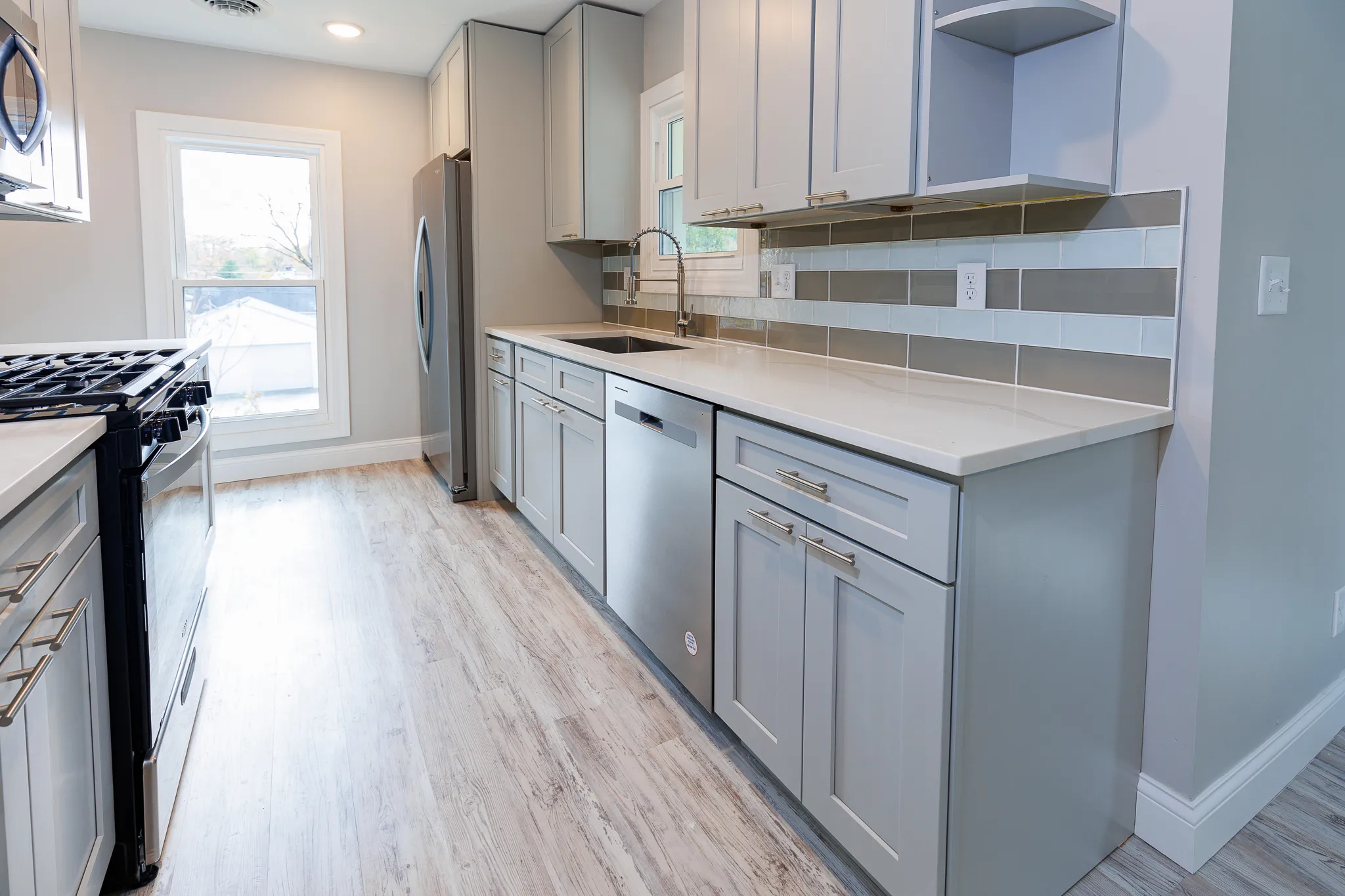 Kitchen & Counters: Stunning quartz countertops paired with all-new, high-end Stainless Steel (SS) appliances, including a side-by-side refrigerator, dishwasher, and built-in microwave.